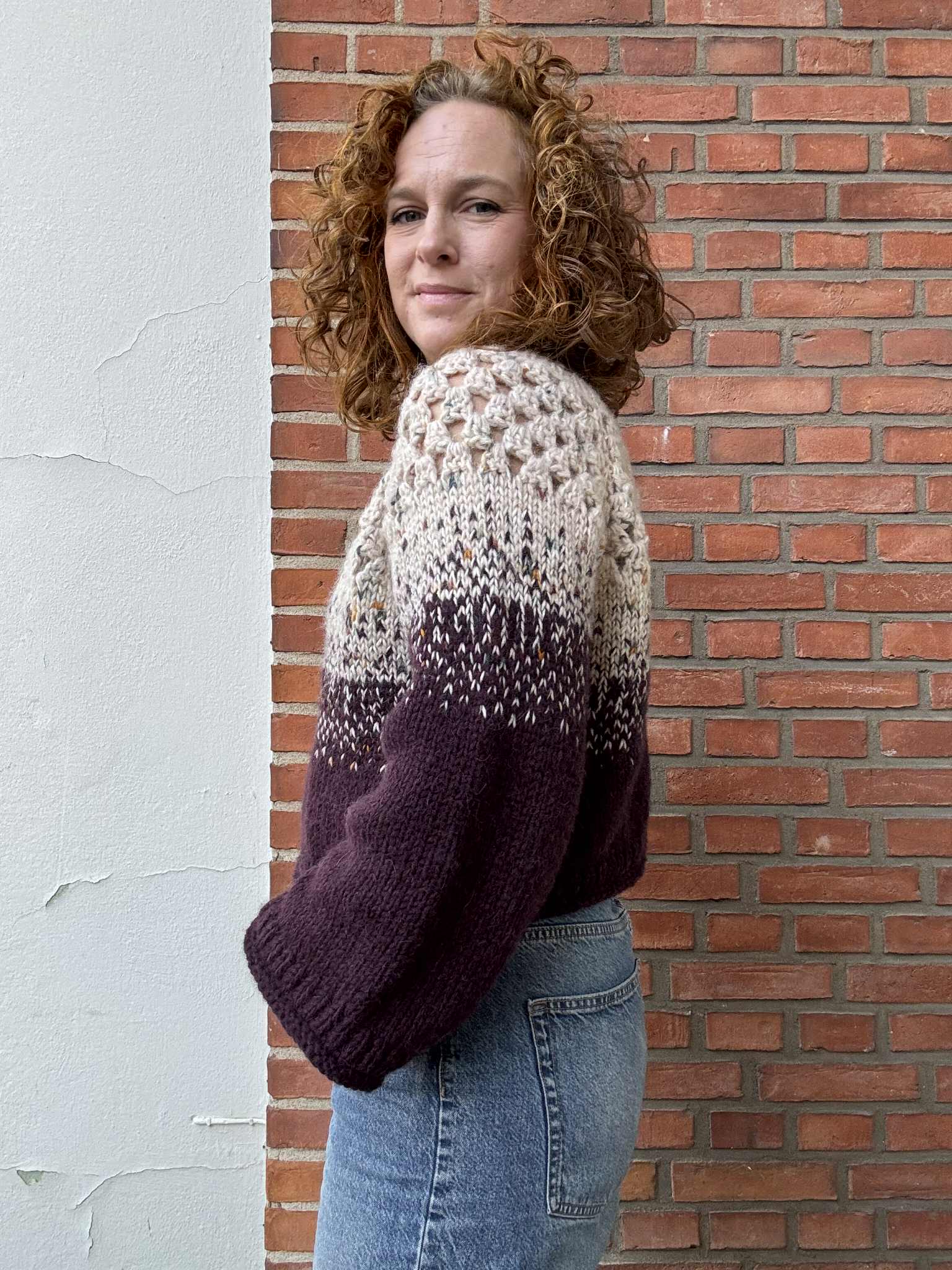 Valg af størrelse: Vælg en størrelse alt efter hvor stor du ønsker din sweater, bemærk dog at ærmegab og hals også bliver tilsvarende større /mindre. Som referencepunkt er den beige/ brune version en størrelse 4 (112 cm) og den lysegule/ lilla en størrelse 5 (118 cm), på en model med brystmål 96 cm.