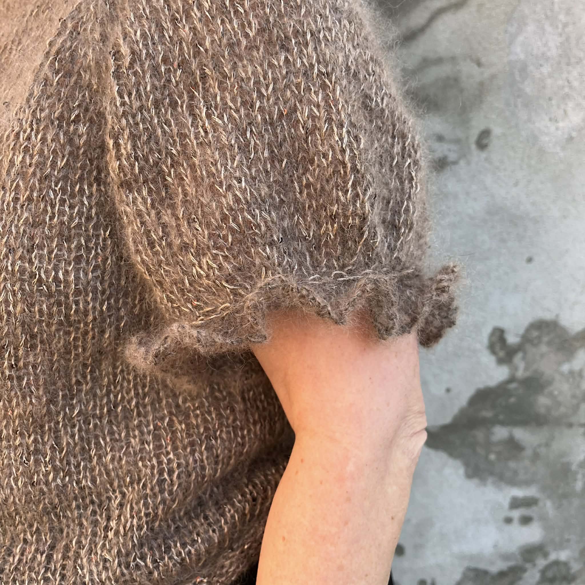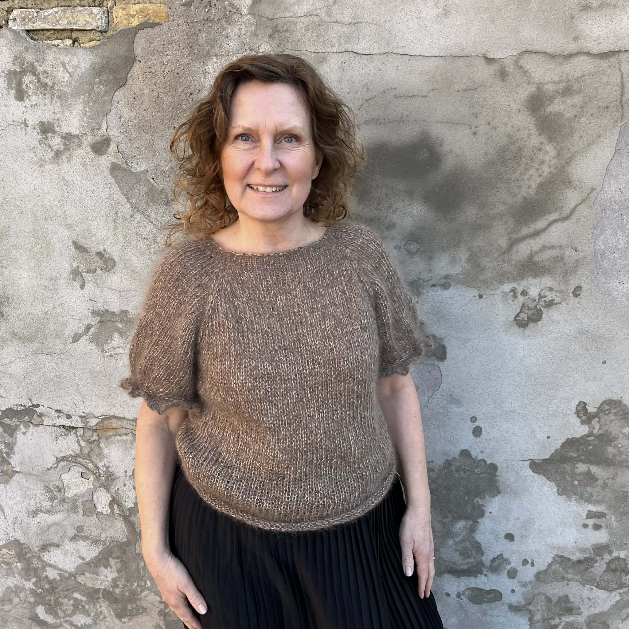 Floras Bluse er strikket oppefra og har kort ærme med let puf og flæsekant