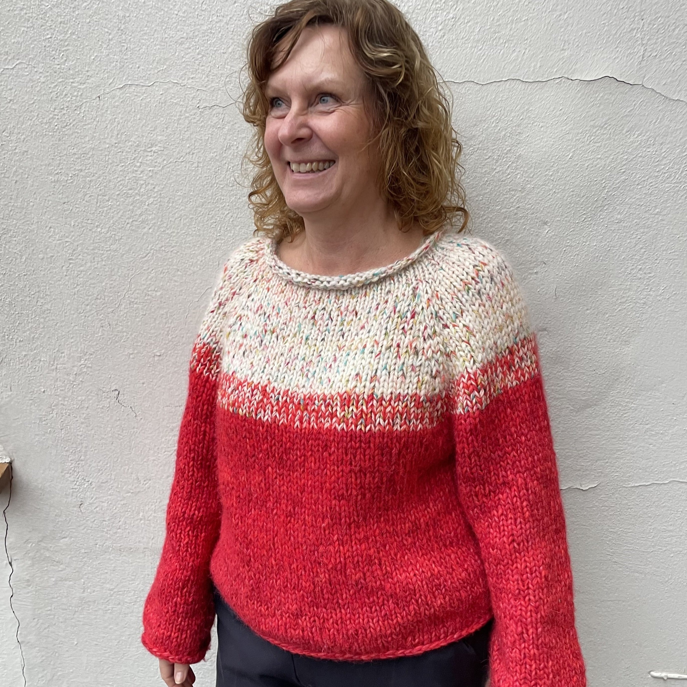 Frederikkes Sweater er en tyk varm sweater med et multifarvet bærestykke. Den er strikket rundt oppefra og ned i glatstrik, så både krop og ærmer kan få lige den længde, der ønskes.